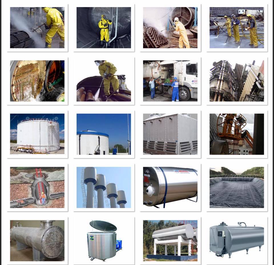 Mais de 140 tipos de limpeza técnica: limpeza de maquinas, equipamentos, estruturas, tanques, reservatórios, condensadores, trocadores de calor, rios, lados, silos, industrias, ruas, tanques de combustível, tanques de óleo, estruturas metálicas, entre outros;