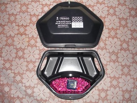 Fixado no chão, utiliza em seu interior isca (veneno), a qual é fixa por uma pequena barra de ferro evitando que a mesma tenha contato com o ambiente. Possuí uma TAMPA LACRADA COM CHAVE evitando o contato de pessoas e animais com o produto. Fabricado em PLÁSTICO RESISTENTE.